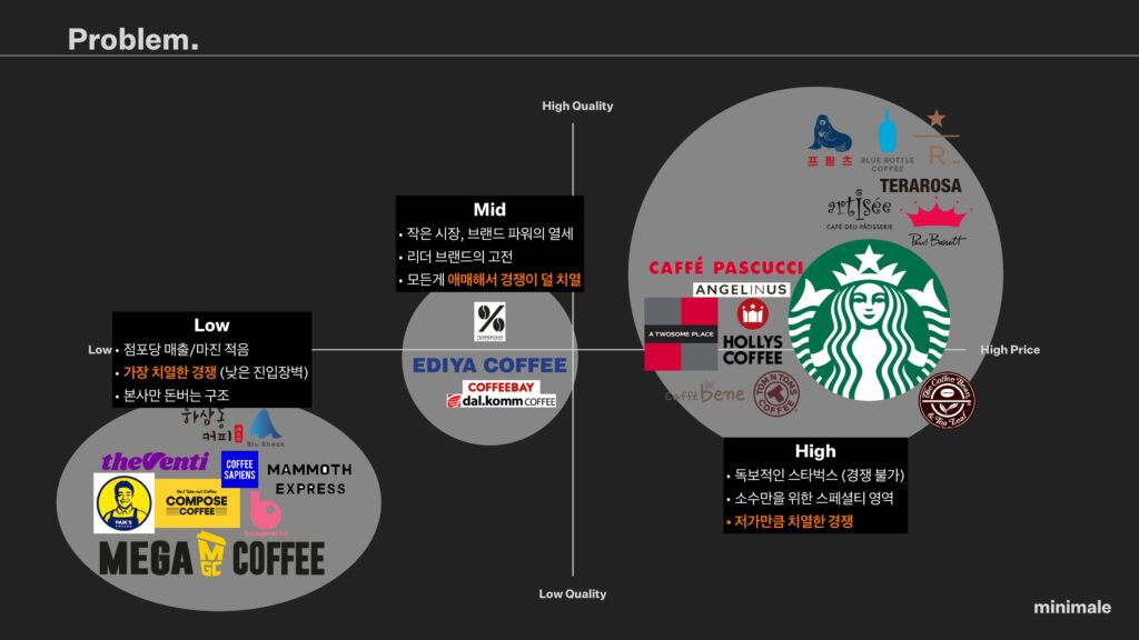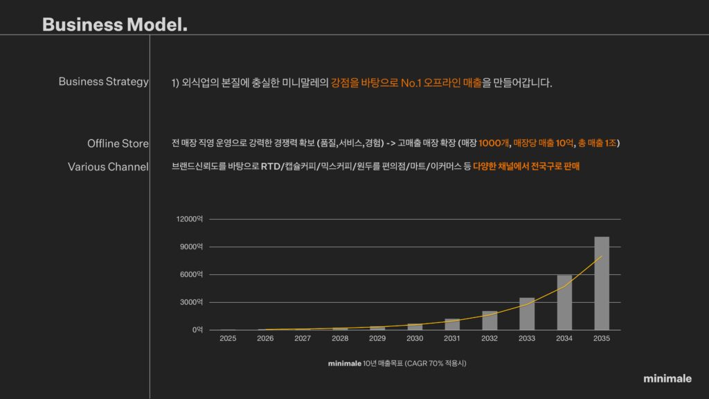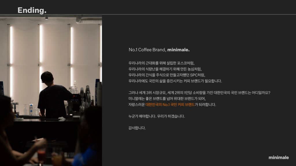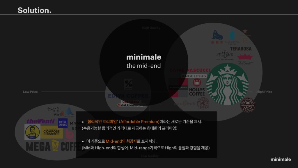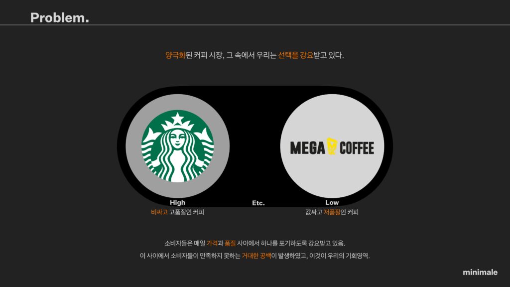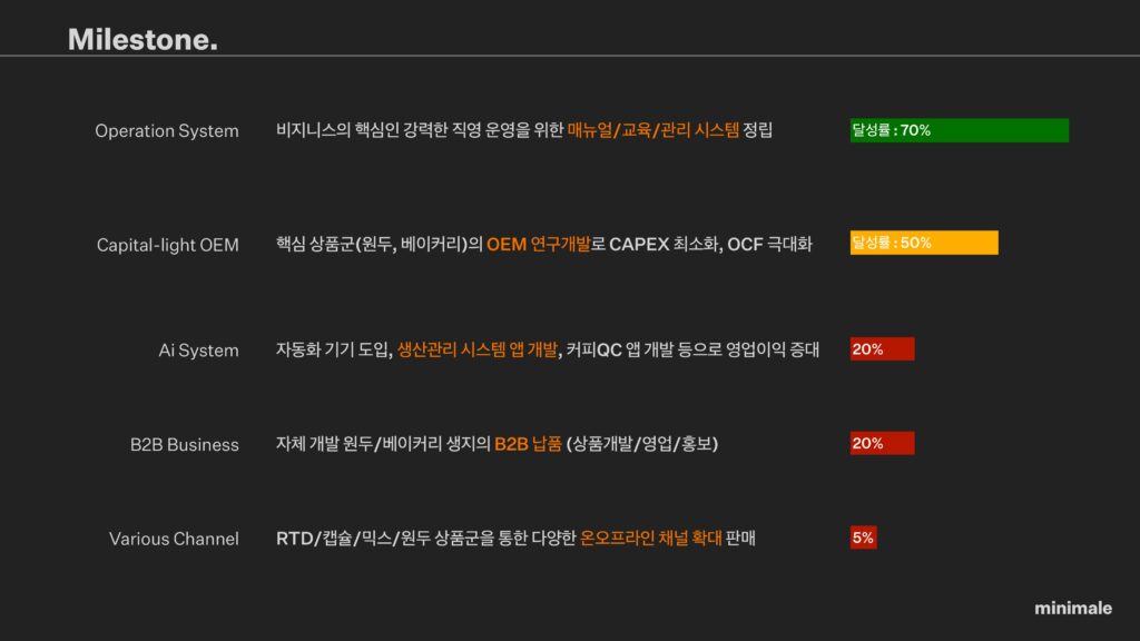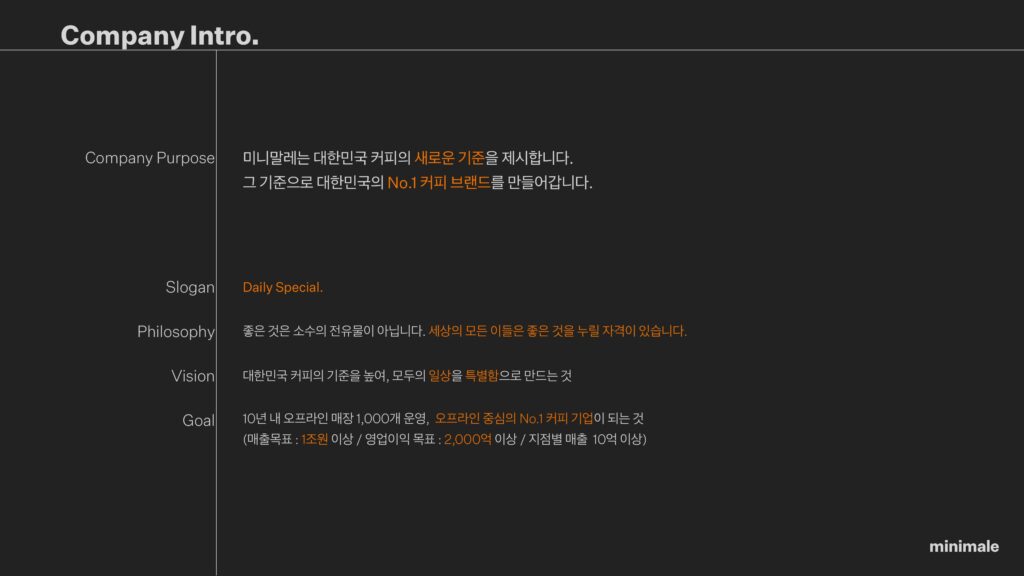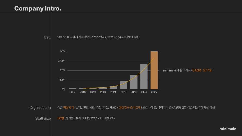 (주)미니말레는 ‘매일의 일상을 특별하게’라는 슬로건 아래, 스페셜티 커피와 수제 베이커리를 결합한 ‘합리적인 프리미엄(Affordable Premium)’ 커피관련 서비스를 제공합니다. F&B의 본질인 고품질의 맛, 하이엔드 디자인, 합리적 가격을 동시에 구현하며 기존 커피 시장속 블루오션인 미드존을 공략합니다.