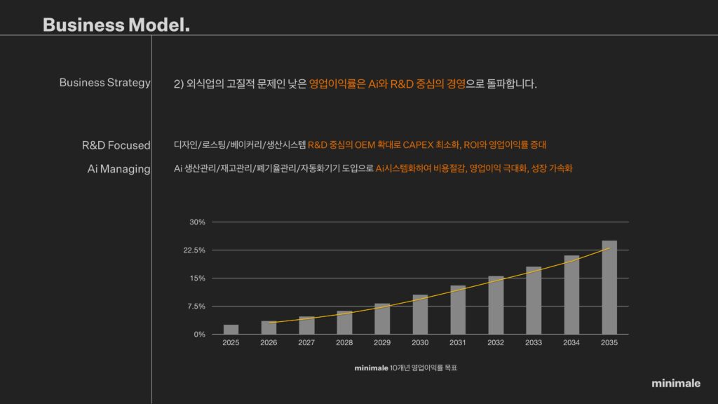 특히 단순 외식업을 넘어, 업계의 고질적인 저수익 구조를 혁신하기 위해 ‘Ai Manager’ 프로그램을 개발하고 적극적인 자동화 기기도입을 통한 Ai F&B 기업을 지향합니다. 데이터 기반의 생산/재고/폐기/출하/인원관리의 최적화 솔루션과 피지컬 AI 기기(자동화 집기 등) 도입을 통해 운영 효율을 극대화하고, 5년 내 20% 이상의 영업이익률 달성을 목표로 합니다.