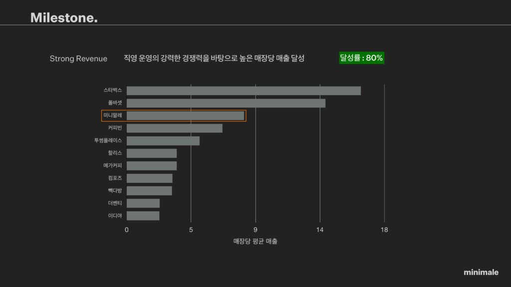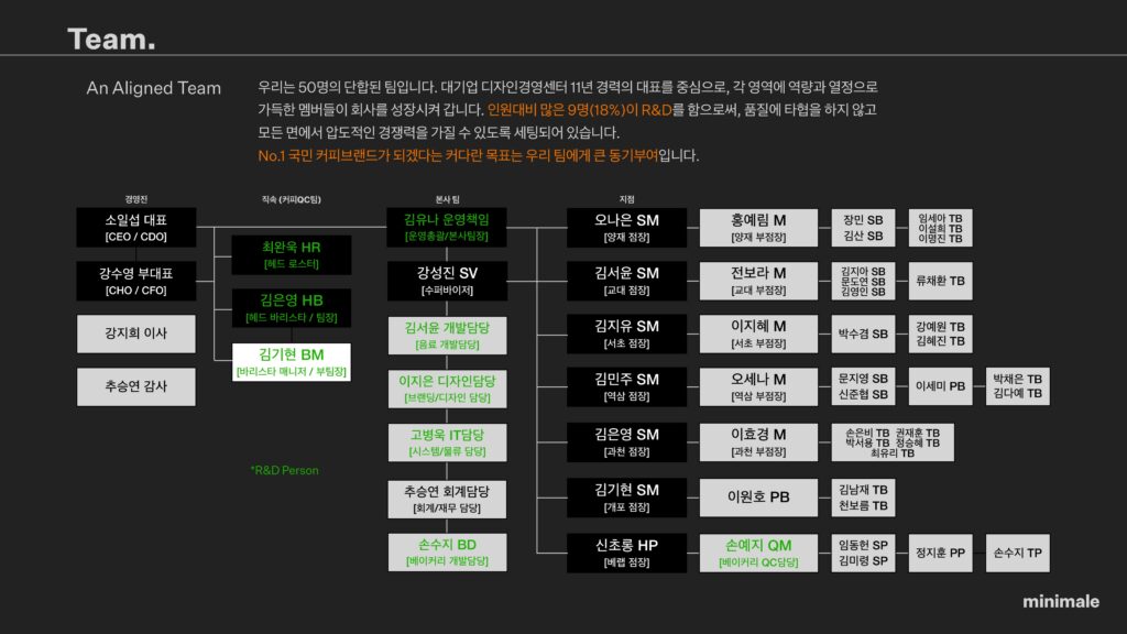 전 지점 100% 직영 운영으로 검증된 독보적인 매출 실적과 58명의 전문 인력들의 역량을 결합하여, 오프라인 거점 확장을 넘어 온라인 채널을 확장힌 대한민국 No.1 커피 브랜드로 도약하고 있습니다.